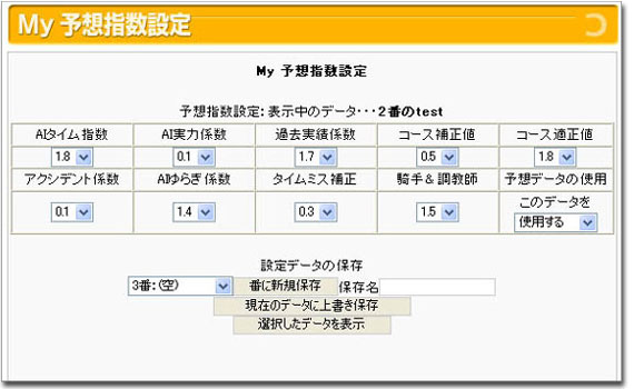 馬成金 for Web最大の特徴であるMyデータ設定では、馬成金指数を9つに 分け、それぞれに20段階まで調整可能な補正値を設定しオリジナル予想を 作成することが出来ます。作成したオリジナル予想データを元に予想を 行い、その結果を出馬表&馬成金予想閲覧画面へ反映させることが出来ます。 このオリジナル指数は5つまで保存可能で、それぞれの結果を検討しさらに優秀な オリジナル指数を作成してみては?